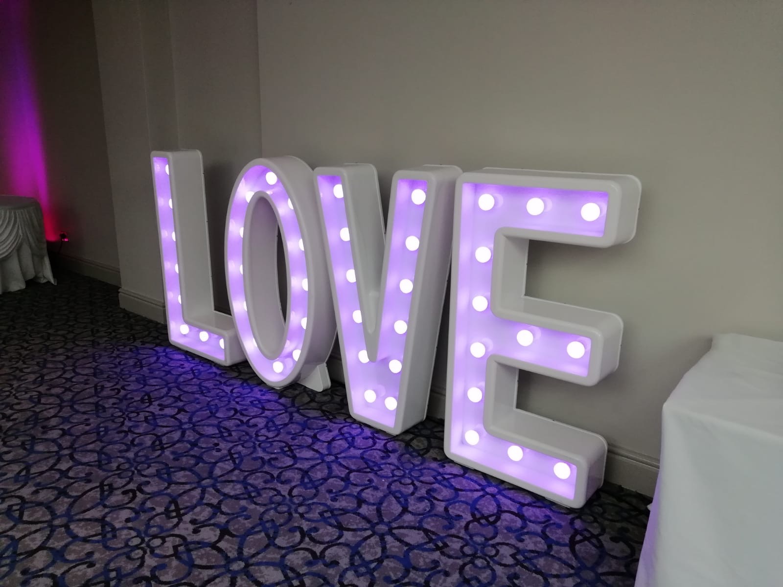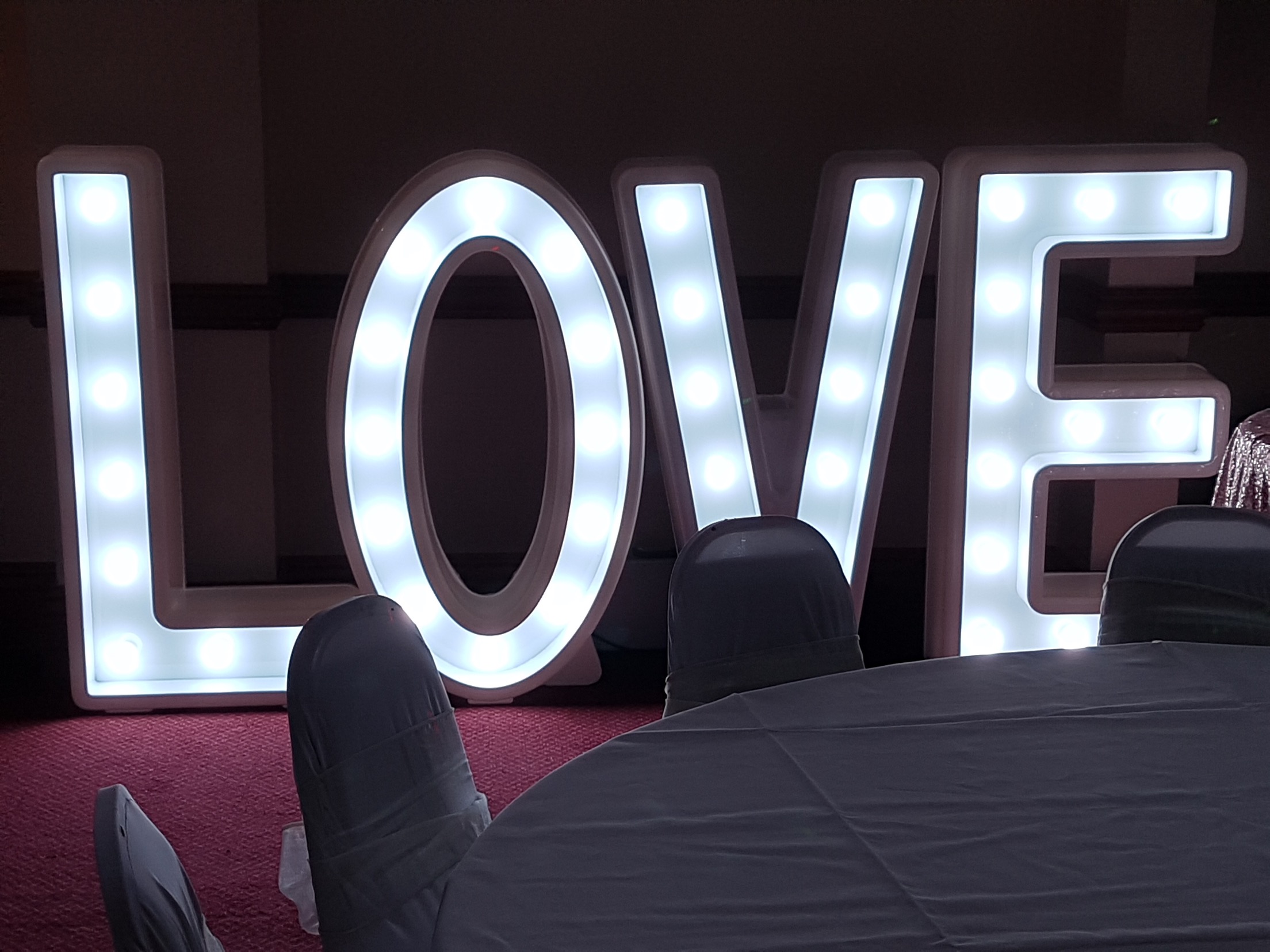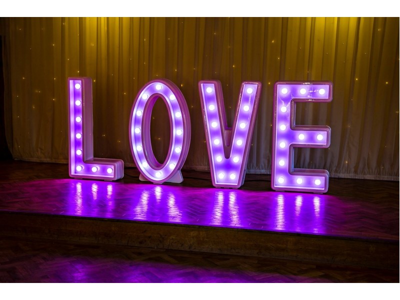 LOVE Letter hire for your Wedding or party! Our large 4ft LOVE letters come with a difference! They can be set to ANY colour, or colour change throughout the day!